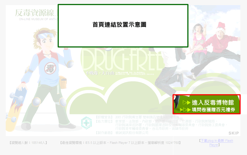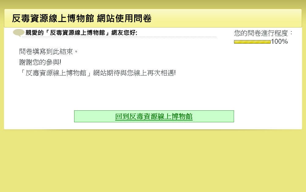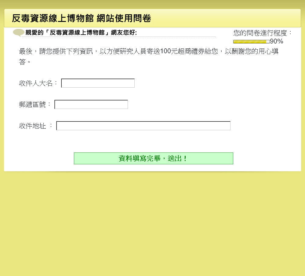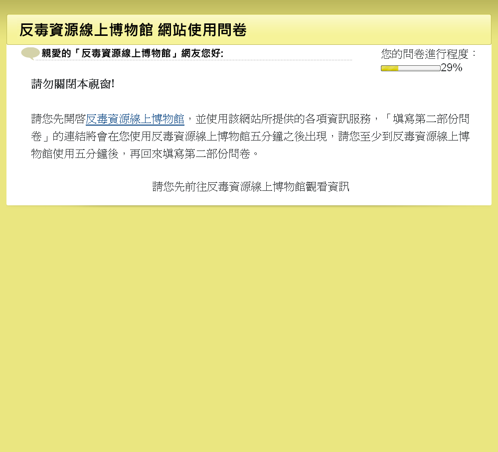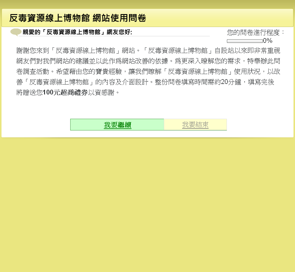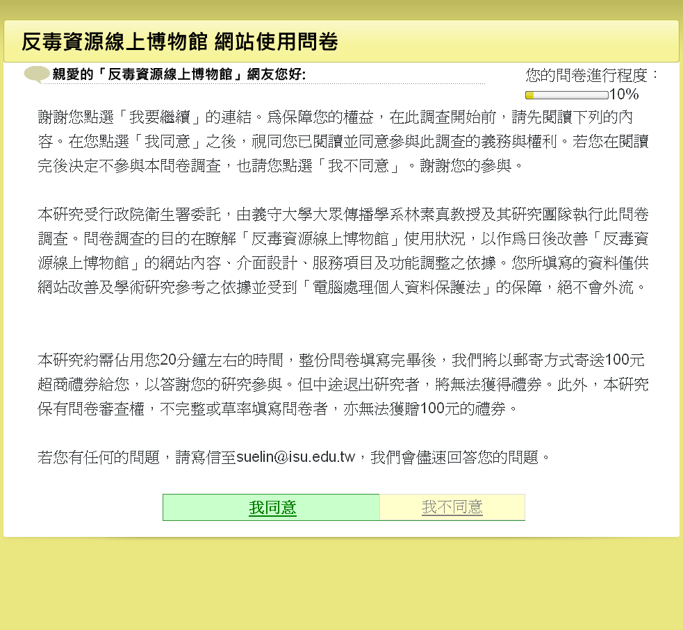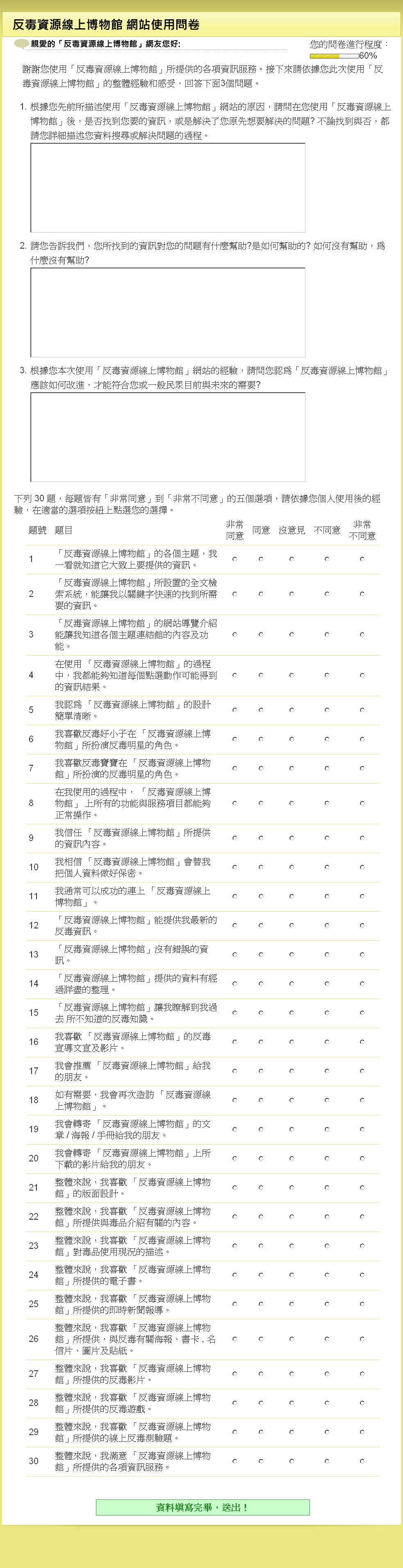 研究目的根據法務部的資料顯示,台灣地區保守估計吸毒與販毒者已逾二十萬人,也就是每一百人中至少有一人吸食毒品,且毒品犯罪也相當嚴重,在監獄服刑的犯人當中,菸毒犯就占四成。有鑑於此,政府自民國八十二年起,結合相關部會及民間資源,以斷絕供給及減少需求為反毒策略之基礎,全面展開各項反毒工作,並將2005年至2008年定為「全國反毒作戰年」,但壓制毒品的成效,仍僅限於零星治標。如何積極地從教育宣導的扎根著手,讓國內所有的未吸毒人口,都能對毒品有基本的認知,免於毒害,此舉在新興毒品取得的管道愈來愈多元、吸毒年齡下降,以及毒癮階層擴散的情形下,更顯迫切。 在減少需求的反毒策略上,世界各國無不致力於各項藥物濫用的防制工作如藥物濫用預防模式、教具教材、防制宣導及社區健康營造,以結合家庭、學校、媒體、社區組織及醫療院所,共同推動藥物濫用行為改變預防介入模式,以期達到防制藥物濫用之成效。我國在衛生署、教育部、法務部及新聞局等相關政府部門,就其主管業務及權責,充分運用各種傳播管道及方式,積極推廣各種反毒的宣導活動,加強民眾的反毒觀念,增加其對毒品危害的認識,以達到反毒、拒毒的目的。除此之外,民間團體,各大學相關社團、反毒運動促進會、富邦文教基金會及國際青商會等,也在政府的鼓勵下,紛紛加入反毒教育宣導活動的行列。其中,法務部的『向毒品宣戰』、教育部的『春暉專案』及衛生署的『向毒品說不』等更是行之有年、多數民眾耳熟能詳的高知名度反毒專案計畫 。 國內雖已致力於反毒防制宣導多年,但具體評估防制成效的研究並不多,且未見針對大型反毒計畫作整體性評估的研究。本研究擬以行政院衛生署管制藥品管理局所提供的反毒資源線上博物館為研究對象,瞭解反毒資源線上博物館的使用現況與使用者對其資源可用性的看法,以具體評估使用者對反毒資源線上博物館網站的滿意度。 研究方法一、研究方法反毒資源線上博物館的使用現況分析 為瞭解反毒資源線上博物館的使用現況,研究者以查詢過程記錄分析(weblog analysis)的技術來進行網站的評估,以研判反毒資源線上博物館的成長趨勢及造訪者的行為。 (一)、資料蒐集 在評估網站系統成效的研究中,查詢過程記錄分析的技術在近年來已被用來了解使用者最常存取的網站資料,以提供系統管理者在改善網站架構和組織上的參考,並可在不干擾造訪者使用過程的情況下,分析造訪者的網站使用行為[12-15]。為分析反毒資源線上博物館的使用現況,研究者向行政院衛生署管制藥品管理局申請反毒資源線上博物館從95年11月至97年10月的共2年的過程記錄資料以進行分析。 (二)、資料分析 研究者利用Alterwind軟體公司所發展出來的Alterwind Log Analyzer Professional分析軟体,進行查詢過程記錄分析,以月為分析單位,整理出反毒資源線上博物館所瀏覽的網頁總數(page view)、造訪的次數(visit)、造訪時所停留的時間長短、最受歡迎的頁面等造訪者使用行為等資料。佐以統計分析技巧,研究者擬以時間為軸,連續性描繪反毒資源線上博物館網站的成長曲線,並根據網站內容的變革、外在環境的動態變化來解釋其成長的源由,並由觀察反毒資源線上博物館網站的成長狀態,來概括性描繪反毒資源線上博物館網站的使用者行為。 二、反毒資源線上博物館的資源可用性及滿意度評估 為瞭解反毒資源線上博物館的資源可用性(usefulness)及使用者對網站的滿意度,研究者以Dervin[16,17]的意義建構理論為基礎,並參考陳祥[14,15]及Swanson[18] 的研究設計,以線上問卷調查的方式來評估反毒資源線上博物館的使用是否能滿足使用者資訊問題的程度及其與網站滿意度的關係。 (一)、研究設計及進行步驟 受試者為97年度反毒資源線上博物館網站的實際使用者。研究者在行政院衛生署藥品管制管理局的同意下,在反毒資源線上博物館網站的首頁置入「填寫反毒問卷,獲贈超商禮券100元!」,點選該banner即可連結進入研究者所租用的伺服器上的研究網頁,在受試者於網頁點選並送出同意參與此研究調查的同意書及閱讀完網路問卷填答需知後,研究網站上會跳出兩個視窗:第一個是研究第一階段視窗,要求受試者填寫「使用者基本資料」與第一階段「資訊使用行為探索」問卷。在受試者送出第一階段問卷後,第一階段視窗即關閉並連結回反毒資源線上博物館網站;第二個「提醒視窗」,提醒受試者在瀏灠完反毒資源線上博物館網站後需點選提醒視窗上的第二階段問卷按鈕,以進行第二階段「資訊使用行為探索」問卷的填寫。在受試者送出第二階段「資訊使用行為探索」問卷的答案後,即可進入姓名及地址頁填寫為收到100元禮券所需之資料。本研究藉由上述研究流程,於2008年6月18日~2008年8月19日,共募集1003人參與此調查實驗計畫。執行線上評估的程序如圖所示: 圖2-1:線上問卷調查進入首頁 圖2-3:線上問卷調查研究參與說明 圖2-4:線上問卷調查研究參與同意書 圖2-5:線上問卷調查兩階段研究步驟說明 圖2-6:線上問卷第一階段問卷內容 圖2-7:線上問卷調查第二階段問卷填寫說明 圖2-8:線上問卷第二階段問卷內容 圖2-9:線上問卷調查百禮券寄送說明 圖2-10:線上問卷調查研究結束致謝 研究結果一、 反毒資源線上博物館的使用現況分析 Alterwind Log Analyzer Professional可整理出相當